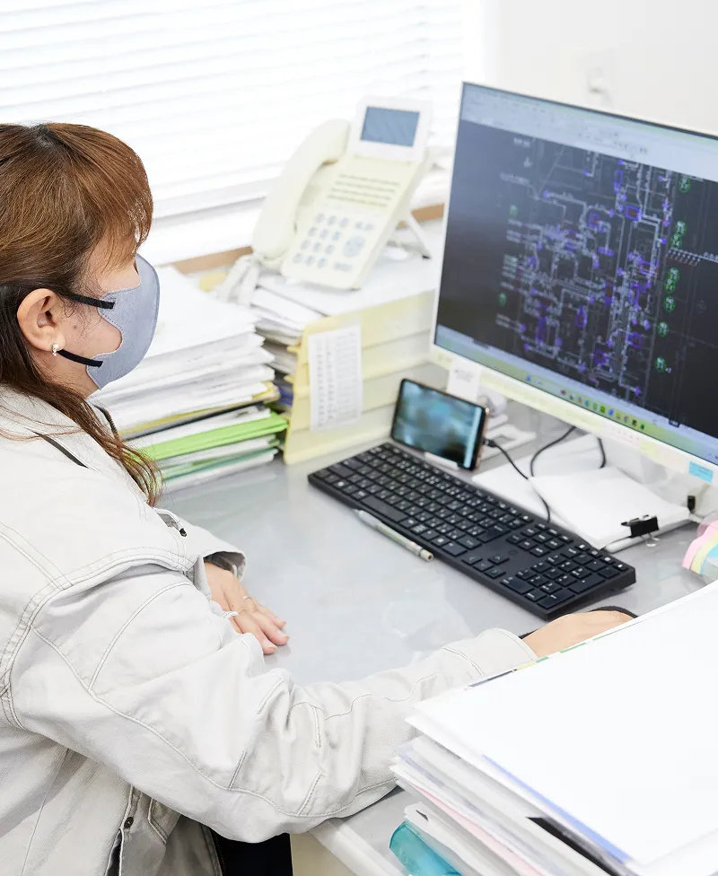 空調設備の新築・改修における設計業務を担当します。熱負荷計算の基準値などに基づき、空調機の選定・配管経路・風量などを検討し、CADにて配管の施工図面を作成します。図面は単なる線だけに見えますが、その線を引くために幅広い知識と根気強さが求められる、地道ながらも奥深い仕事です。