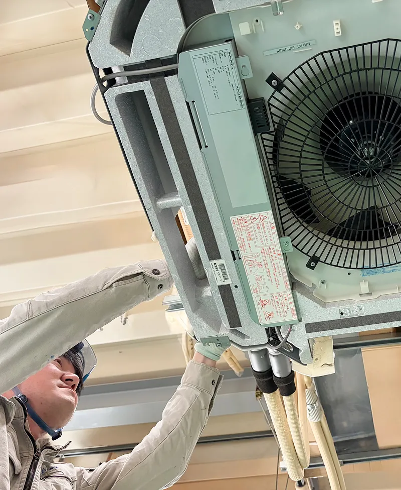 エアコンなど空調設備の設置工事が、施工における業務の中心です。現場では機器の設置・配管・電気工事、場合によっては天井の開口・補修などの内装工事まで幅広く携わります。現場の第一線で実際に手を動かし、お客さまに快適な空間を直接お届けする、やりがいのある仕事です。